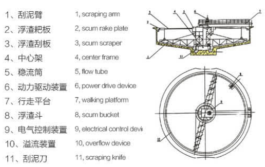 特點(diǎn):該機(jī)采用中心傳動(dòng)垂架式,下部采用整體對(duì)數(shù)螺線刮 板,上部設(shè)有浮渣收集裝置,池壁四周設(shè)溢流裝置及浮渣 排出裝置。該機(jī)傳動(dòng)機(jī)構(gòu)為行星擺線針輪減速機(jī)與帶外齒 的大型回轉(zhuǎn)支承二級(jí)減速具有傳遞扭矩大,運(yùn)轉(zhuǎn)平穩(wěn),穩(wěn) 流效果好等優(yōu)點(diǎn)。