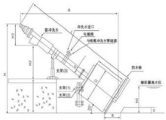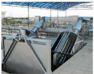 轉(zhuǎn)鼓式格柵機與水平面成35°角安裝在水渠中,污水從轉(zhuǎn)鼓格柵的端頭流入轉(zhuǎn)鼓格柵中,通過格柵側(cè)面的柵縫流 出,格柵將水中的懸浮物、漂浮物等截留在轉(zhuǎn)鼓中,轉(zhuǎn)鼓格柵以4.6r/min的速度旋轉(zhuǎn),轉(zhuǎn)鼓式格柵機的上方有尼龍刷和 沖洗水噴嘴,將柵渣從柵縫中清除,同時通過螺旋輸送并擠壓脫水,最后通過轉(zhuǎn)鼓格柵上端的排料口,物料落入垃圾箱或輸送機外運。